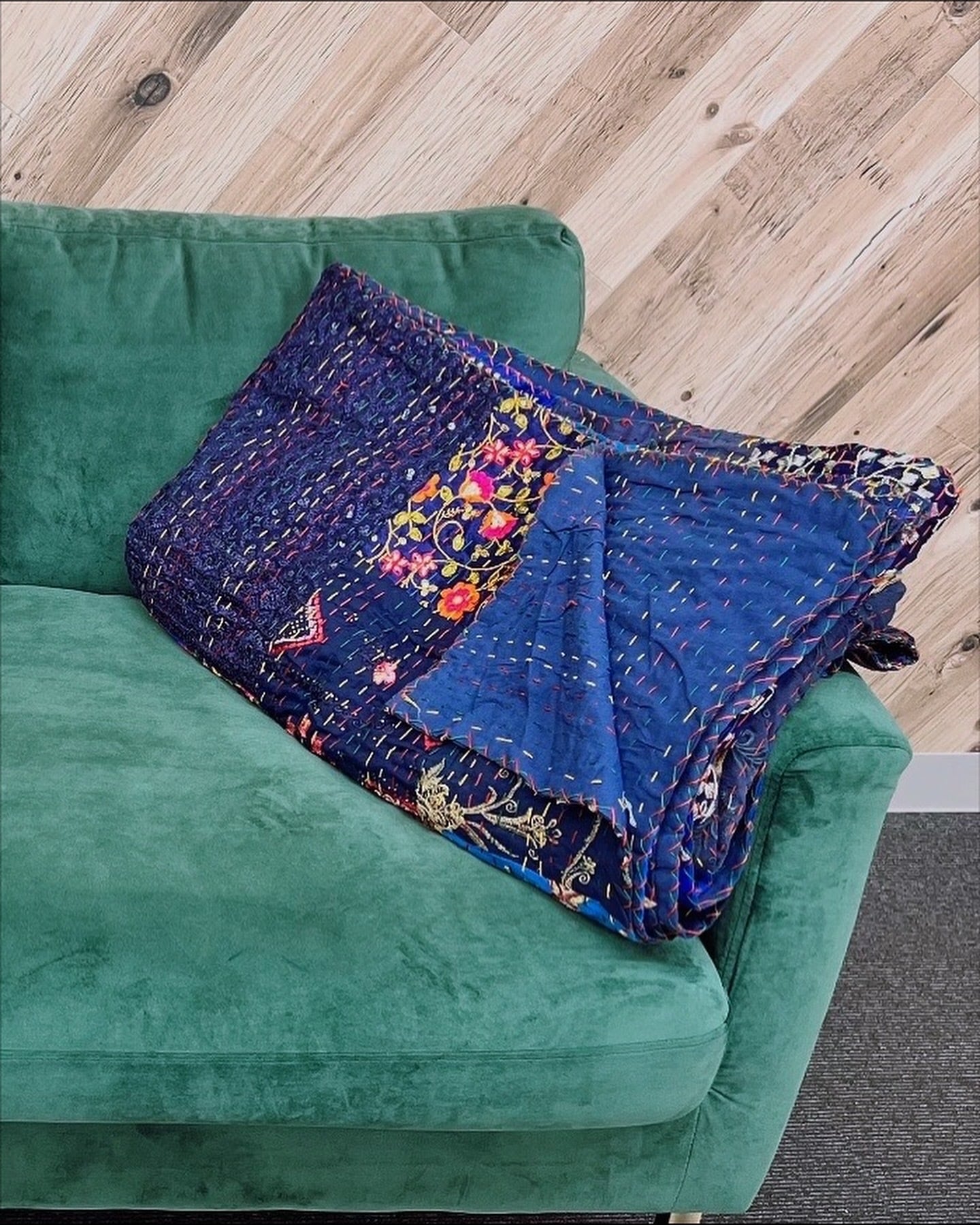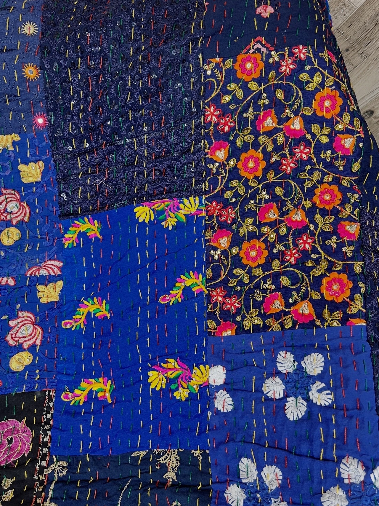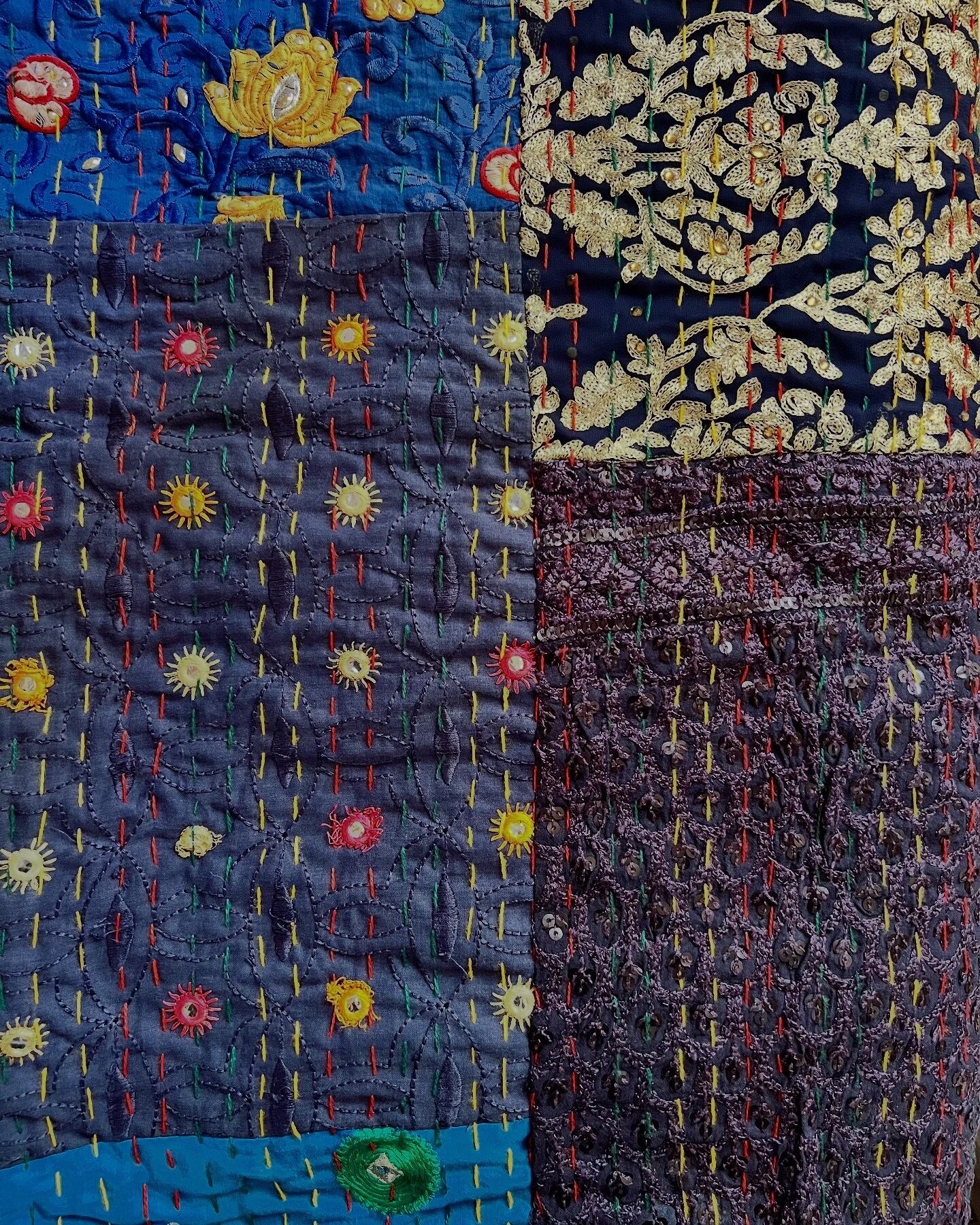 サリーなどの古いドレスをパッチワークにして、針と糸を使って全体的にステッチされています。